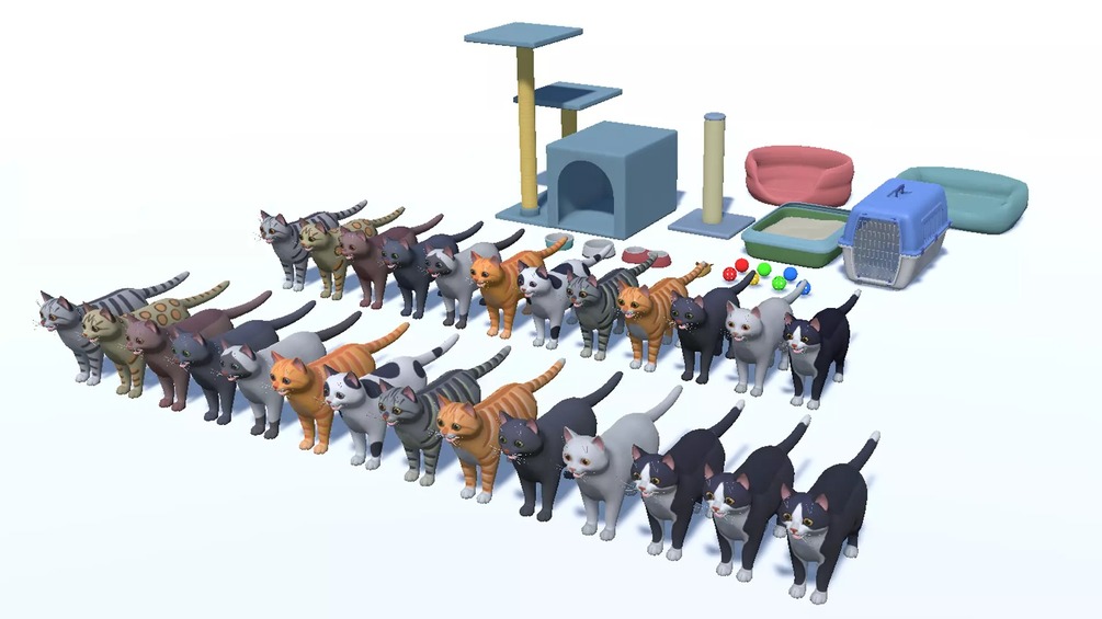 The asset includes cat accessories: food bowls, balls, cat toys, cat tray, cat house, carrier, scratching post, cat beds.